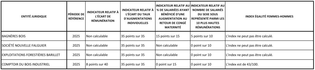 Selon les critères définis pour mesurer l’égalité femmes / hommes, l’ensemble des groupes « valables » étant inférieurs au seuil représentatif de 40 % des effectifs, il n’y a pas de calcul d’index significatif pour les sociétés suivantes : Exploitations Forestières Barillet, Bagnères Bois et Société Nouvelle Falguier.
